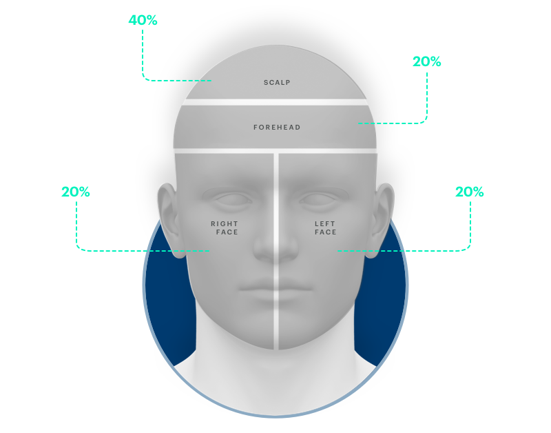 To determine the AKASI score, the head is divided into four areas: scalp, forehead, left and right face.
