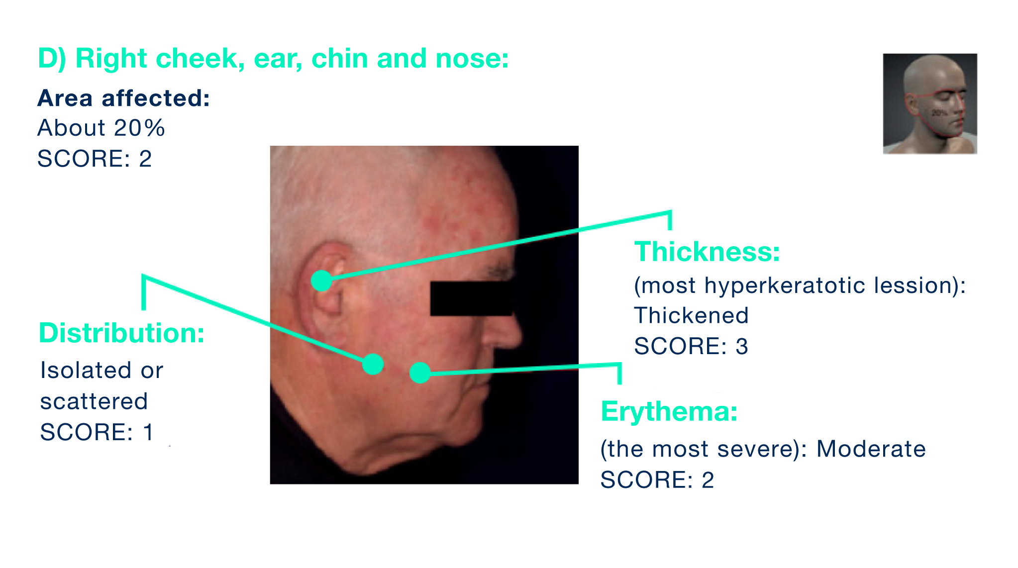 - Sandpaper-like texture should be included in the estimation of area affected. Also include areas covered by hairs into your estimation (e.g. if the scalp is fully covered by hairs there is often no actinic keratotic damage – area score for scalp in this case is 0).